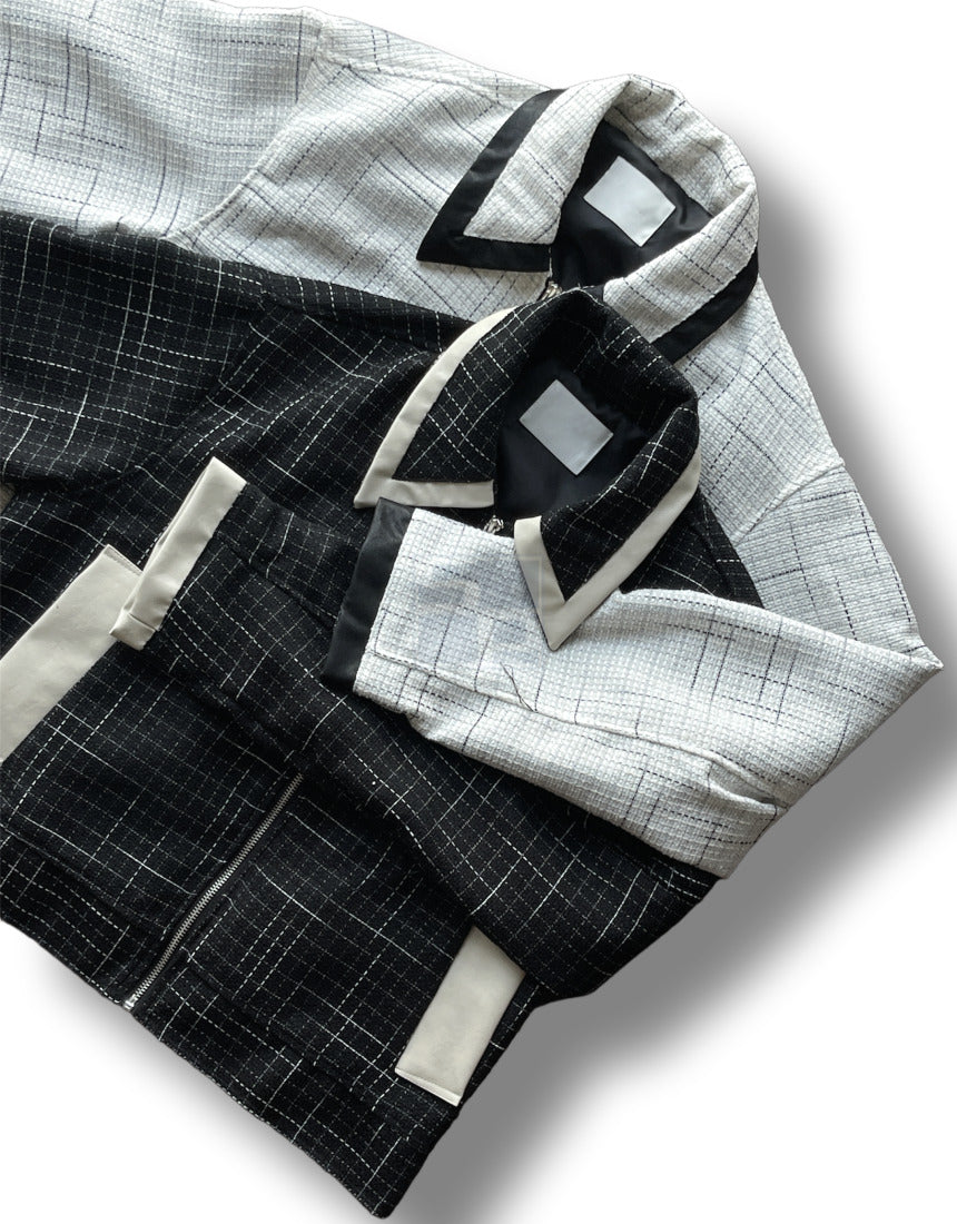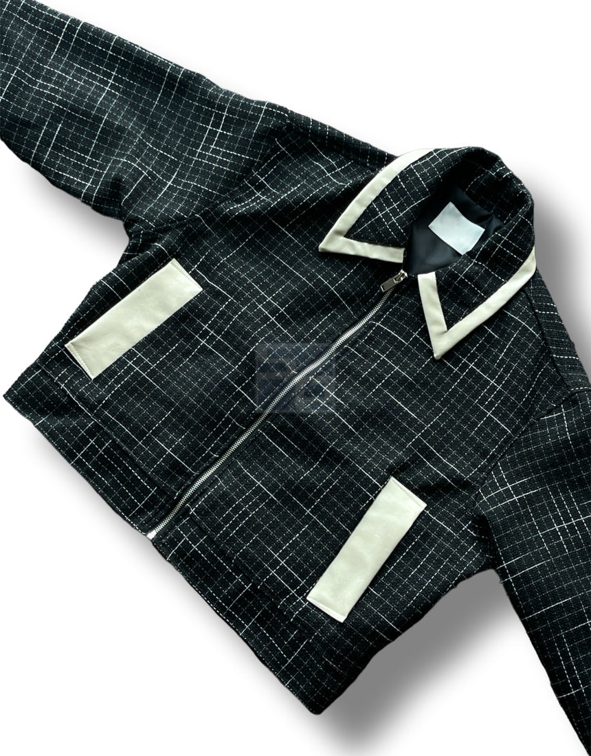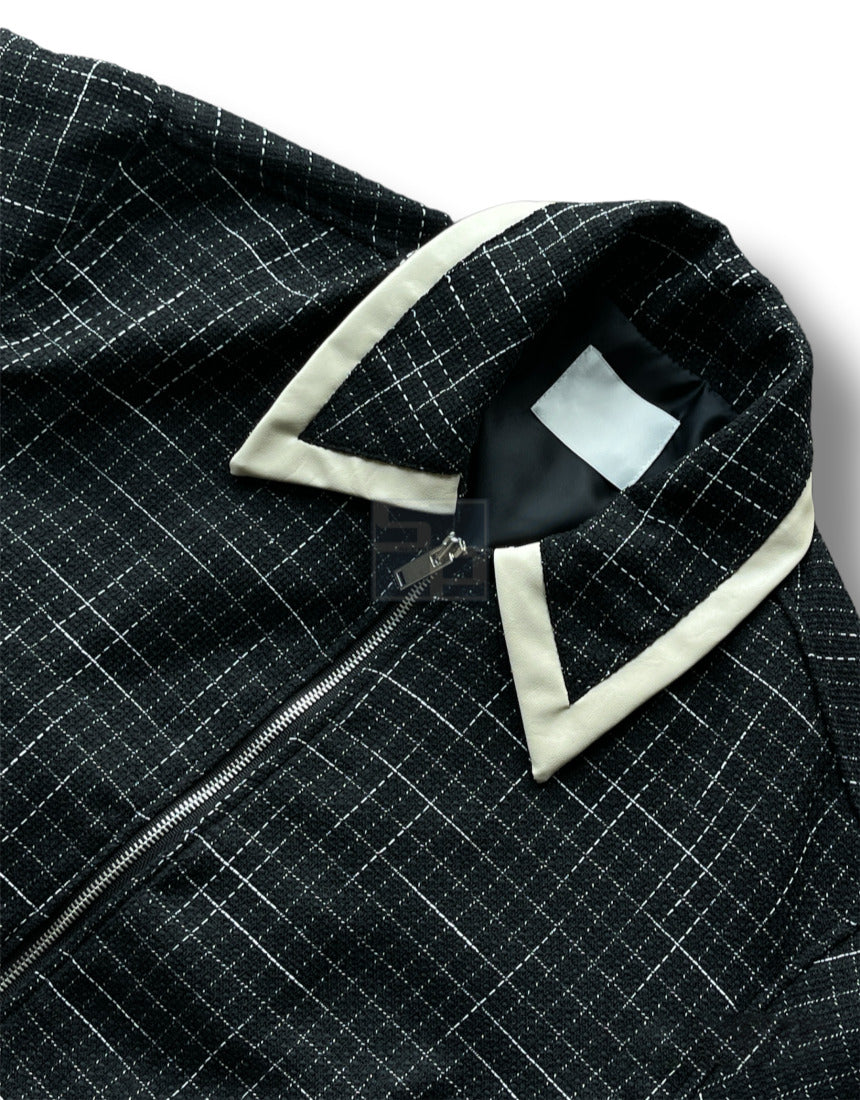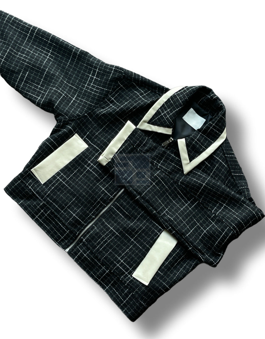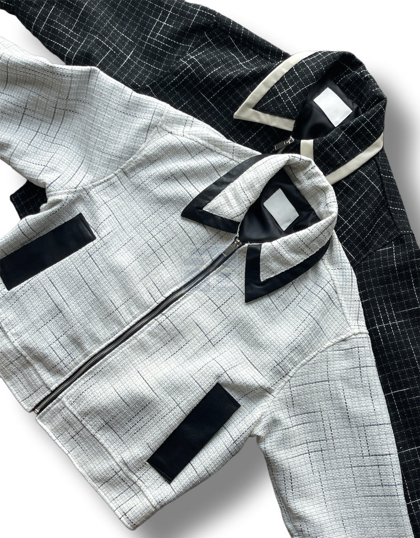 Leather Color Matching Cropped Jacket Tweed Short Jacket Black Ivory