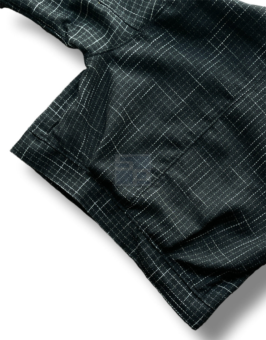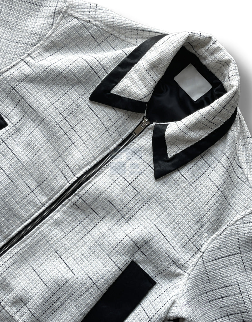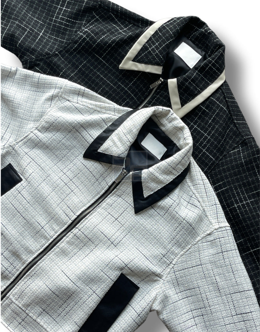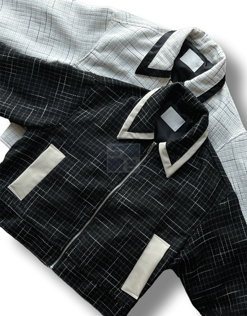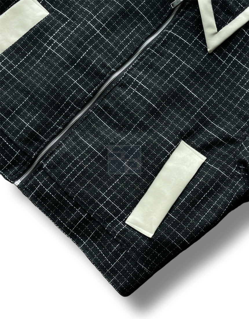 Leather Color Matching Cropped Jacket Tweed Short Jacket Black Ivory