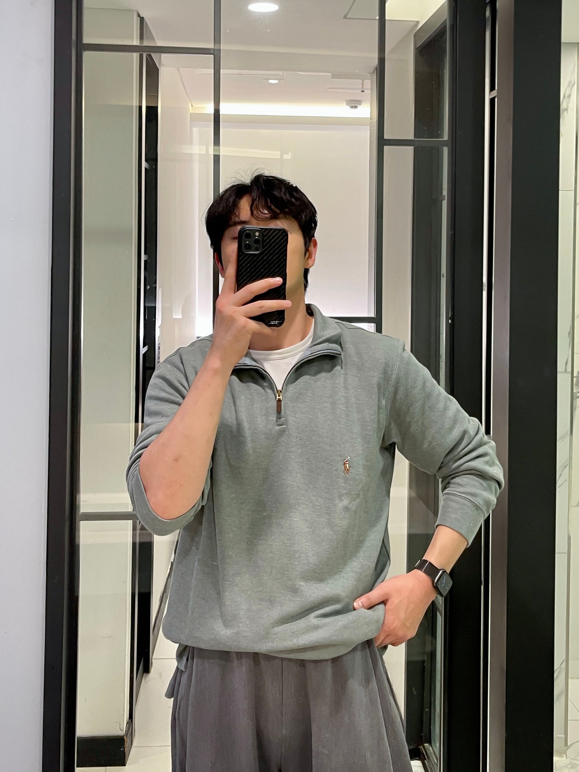 심플하면서 클래식한 반집업 디자인에 가죽 디테일의 지퍼 포인트